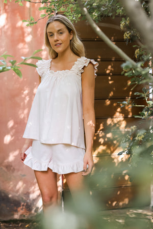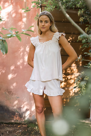 Alba es un conjunto premium, confeccionado con algodón. Lo amamos por sus tirantes y sus vuelitos en el short. Es tan lindo que lo puedes usar para dormir pero también para salir.